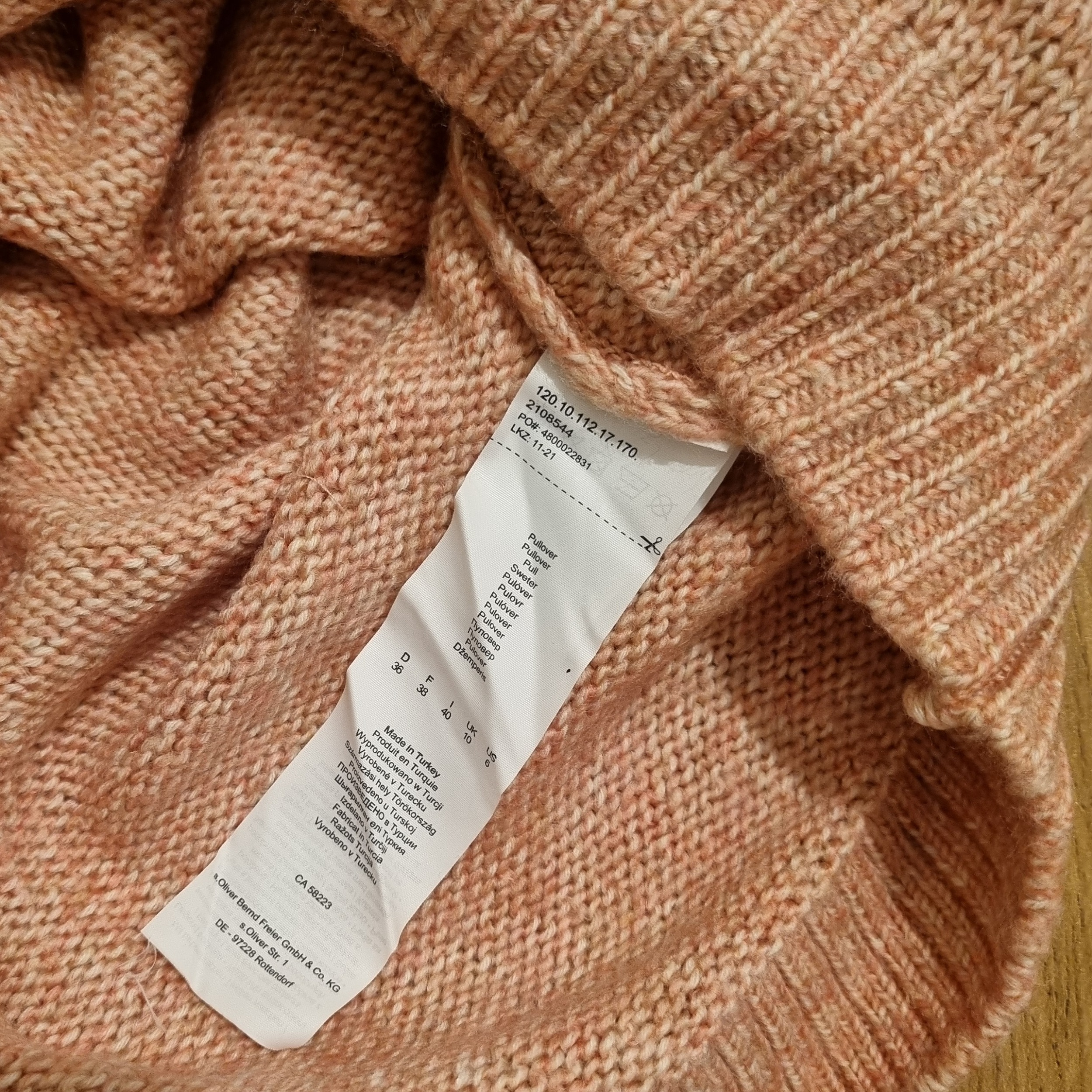 پلیور زنانه از برند اس اولیور آلمان کد S.OLIVER 2108544 از کیفیت دوخت و بافت بسیار بالایی برخوردار است پلیور بافت ضخیم و درشت بافت و گرم بالا و متریال تهیه شده از 56% نخ، 30% پلی اکریلیک و 14% پلی استر می باشد
